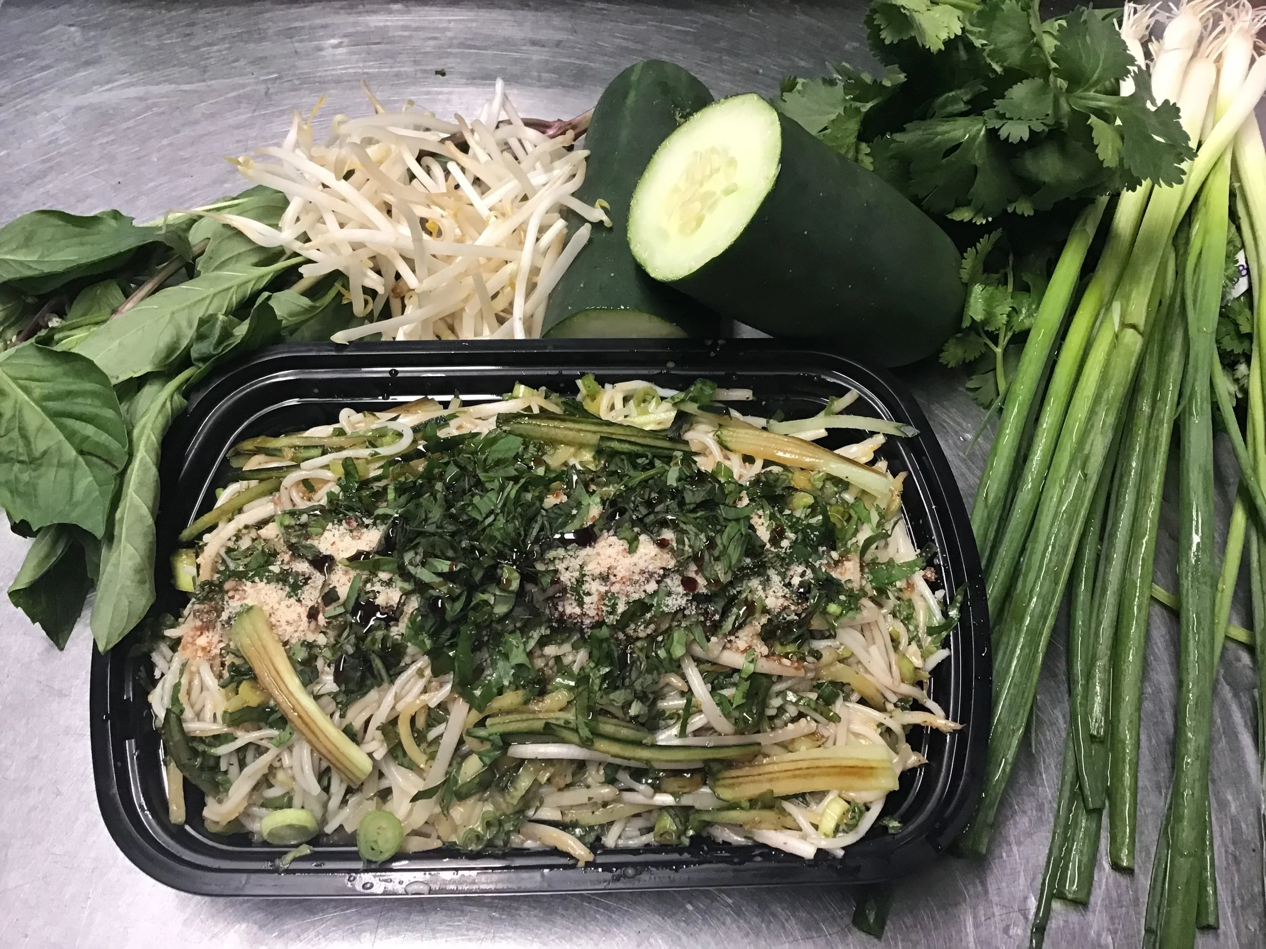 Vietnamese Cold Noodle Salad: vermicelli, bean sprouts, cucumber, cilantro, scallion and Thai basil tossed in house made Shallot-Lime vinaigrette and garnished with chopped peanuts and sweet soy sauce