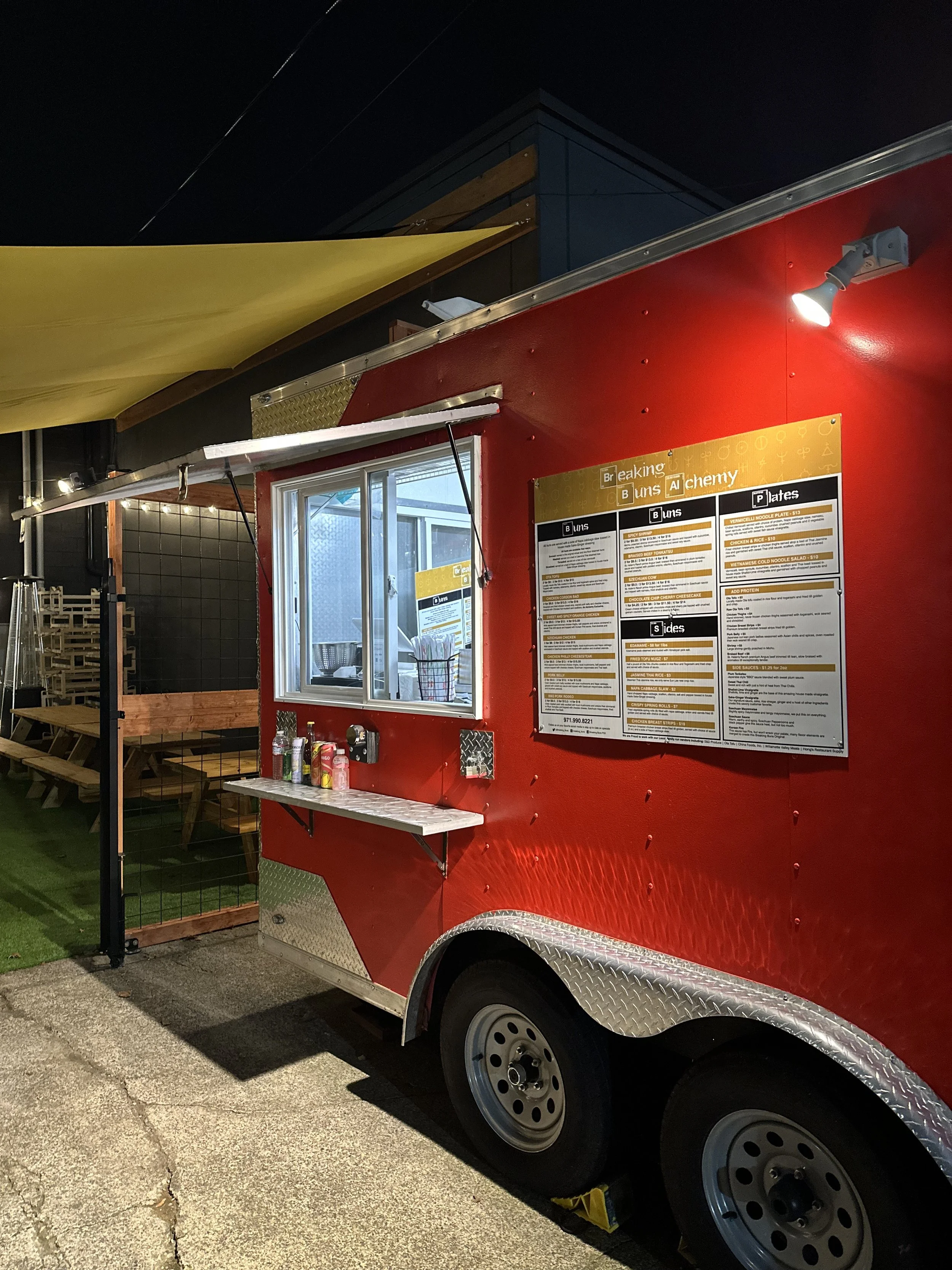 Asian fusion food truck featuring steam buns and side dishes. Parked outside of Alchemy Cider Co.